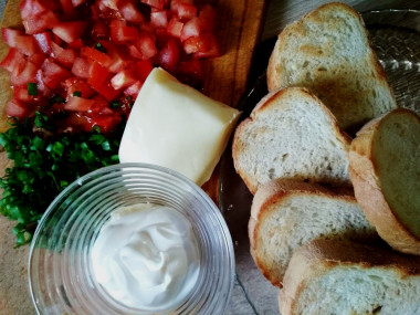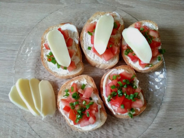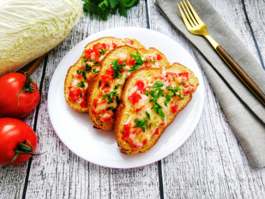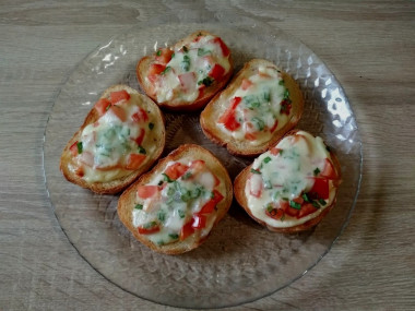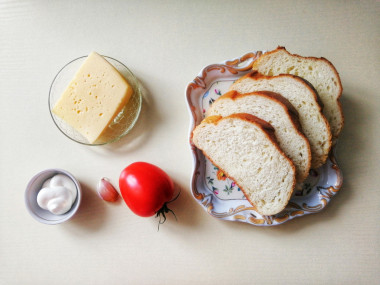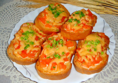 Кусочки батона подрумянила с двух сторон в духовке. Затем натерла чесноком, смазала майонезом. Сверху разложила мелко нарезанные помидоры и посыпала натёртым сыром. Запекала в духовке около 10 минут.