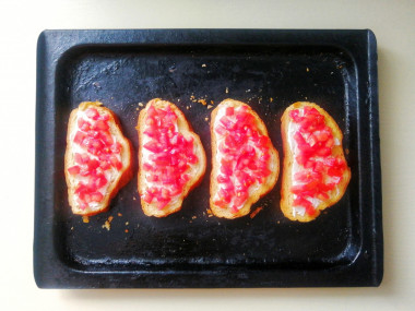 Вытащите противень из духовки. Каждый ломтик батона натрите чесноком и смажьте майонезом. Сверху разложите нарезанные помидоры. Можно посыпать солью и специями на свой вкус.