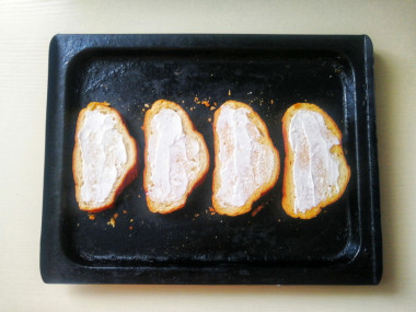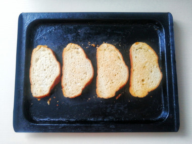 Разогрейте духовку до 180 градусов. Ломтики батона разложите на противне и поставьте в духовку, чтобы они немного подрумянились. Можно в процессе их перевернуть, чтобы они были румяные с двух сторон. На это уйдет 7-10 минут. Ориентируйтесь по своей духовке.