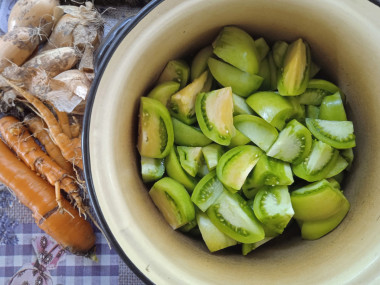 Зеленые помидоры помойте, вырежьте места крепления плодоножек, нарежьте дольками.