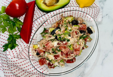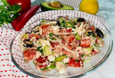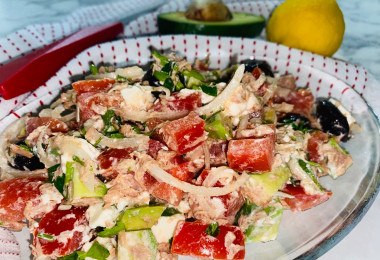 Средиземноморский салат с тунцом, сыром, авокадо и оливками готовиться за считаные минуты, главное, чтобы все ингредиенты было в наличии.