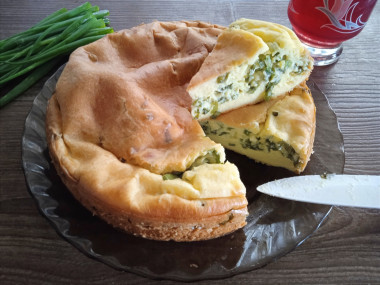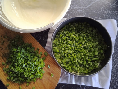 Вмешайте в тесто подготовленный зеленый лук. Можно добавить начинку при заполнении формы тестом.