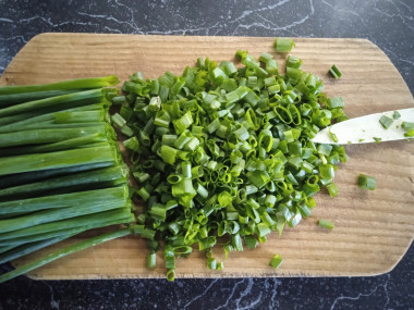 Зеленый лук помойте, обсушите и мелко нарежьте. Духовку включите на 180 С.