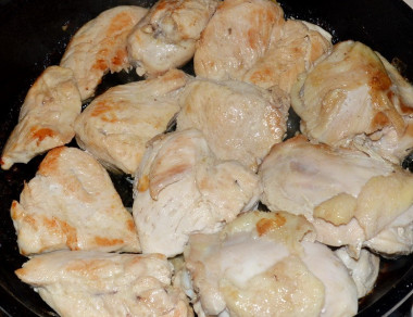 Куриное филе помойте под проточной холодной водой и обсушите бумажными полотенцами. Порежьте курицу небольшими кусочками. В сковороде разогрейте сливочное масло и выложите курицу. Обжаривайте её на среднем огне без крышки до изменения цвета. Не забывайте помешивать.