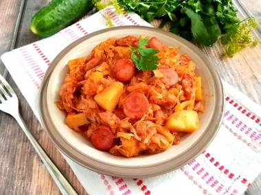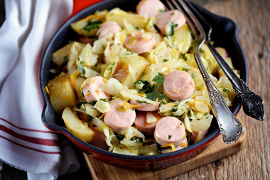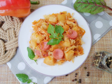Знаю вариант тушеной капусты с сосисками и без картошки. Пробуйте и такой вариант.