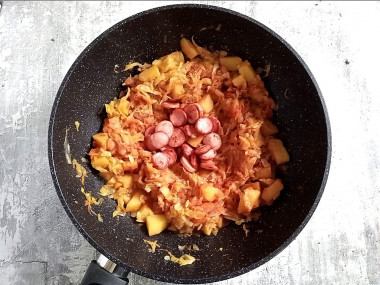 Добавьте оставшееся масло, перемешайте и закройте сковороду крышкой. Тушите все на медленном огне в течение 20 минут, иногда перемешивая. Если будет мало жидкости, чтобы капуста с картошкой и сосисками не подгорела, добавьте 2-3 столовые ложки воды.