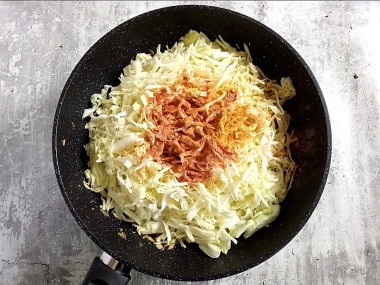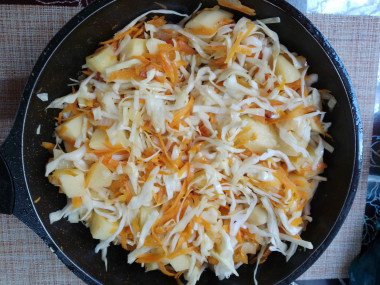 Капусту тонко пошинкуйте и положите в сковороду к остальным овощам. Если капуста жесткая, обычно это капуста зимних сортов, я бы посоветовала совсем немного помять ее руками, тогда она быстрее приготовится.