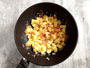 Как жарить картошку и капусту с сосиской? Картофель нарежьте средним кубиком и добавьте в сковороду. При желании картофель можно порезать крупной соломкой или дольками.