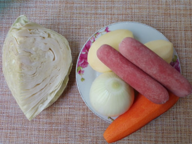 Как тушить капусту с картошкой и сосисками? Подготовьте все необходимые ингредиенты. Овощи вымойте, почистите картофель, морковь и репчатый лук. Обдайте очищенные овощи водой и обсушите.