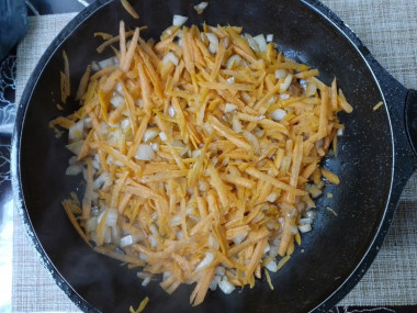 Морковь натрите на крупной терке и положите в сковороду с луком. Морковь можно нарезать соломкой, кубиком или натереть на терке для корейской моркови, если любите более плотную структуру моркови.