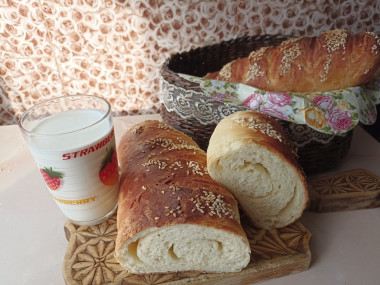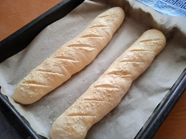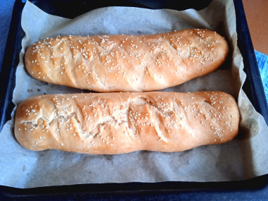 Решила испечь французский батон. Тесто замешивается быстро и просто- безопарным способом. Если вы уверены в качестве используемых дрожжей - то смело можно использовать этот способ, если такой уверенности нет- лучше не рисковать и предварительно проверить небольшое количество дрожжей на активность. Когда тесто в тепле хорошо поднялось, разделила его на две части, каждую раскатала в тонкий пласт, смазала растопленным сливочным маслом, свернула рулетом, затем рулеты скатала валиками и дала им расстояться, но теперь уже в холодильнике. После этого сформировала батоны, сверху сделала небольшие надрезы. При комнатной температуре батоны поднимались на листе минут 15-20. Смазала их молоком, посыпала кунжутом, выпекала при температуре 180 градусов 20 минут. Очень вкусные батоны получились! Спасибо автору за рецепт!