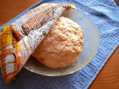 Влейте к сухим ингредиентам теплое молоко, воду и подсолнечное масло, вбейте яйцо. Замесите мягкое и эластичное тесто. Если тесто получилось липким, то добавьте ещё немного муки, если крутым, то влейте чуть-чуть теплого молока. Накройте тесто пищевой пленкой и оставьте в тепле примерно на час. Тесто должно увеличиться в 1,5-2 раза. Точное время будет зависеть от активности дрожжей и температуры в помещении.