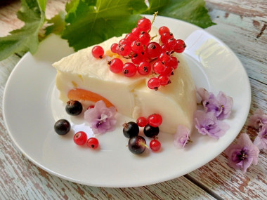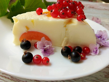 Мы очень любим желейные десерты и летом стараюсь добавлять в них побольше фруктов и ягод. А ещё мы любим желе из желатина сметаны) Поэтому рецепт желе из желатина сметаны пришёлся очень кстати. Я сделала двойную порцию, чтобы получился тортик. Сметана у меня была 20%, часть её я заменила сливками 10%. В сливках я распускала набухший желатин. Нагрела его вместе с сахаром, не доводя до кипения и дальше желатин растворялся сам, только иногда пемешивала его. А как смесь остыла соединила её со сметаной. Красную смородину не стала добавлять в желе, все таки она кисловатая. Вместо неё добавила абрикосы, часть половинками и часть кусочками. А смородиной украсила сверху. Застывал тортик тоже два часа в холодильнике. Желе получилось плотное, хорошо режется ножом. Оно очень вкусное! Прекрасно освежает, вкус сливочный, приятный и кусочки фруктов хорошо сочетаются со сметаной.