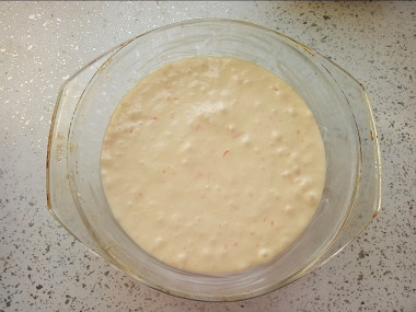 Возьмите форму для выпечки, смажьте ее каплей растительного масла. У меня круглая форма d18см. Вылейте в нее подготовленное тесто.
