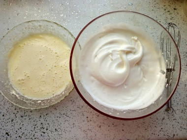 Введите взбитые белки в желтковую массу при помощи венчика аккуратными движениями снизу вверх.