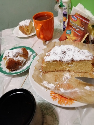 Подавайте пирог к столу. Можете посыпать его сахарной пудрой. Приятного аппетита!
