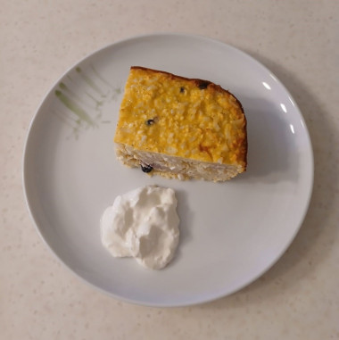 Выложить массу в смазанную сливочным маслом форму для запекания. оставить в разогретую до 180°С духовку на 40-45 минут. Готовую запеканку оставить на 10 минут в духовке, затем вынуть из формы и нарезать кусочками.