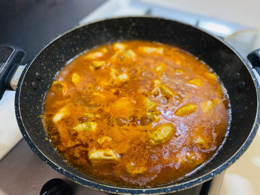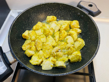К курице добавила своего любимого кари и немного красного перца, обжарила сначала филе, а позже и лук.