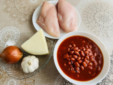 Калорийность продуктов: Курица, Фасоль консервированная, Лук, Чеснок, Томатная паста, Сыр любой, Растительное масло, Соль, Перец черный молотый, Зелень