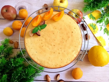 Получился мой корж ровным и гладким! Даже середина не поднялась и не потрескалась. Мякиш пористый, сочный и при этом не тяжелый! Очень приятно попадает на зубок лимонная цедра. На мой вкус сладковато, но сладкоежкам будет в самый раз. Лимон кстати хорошо оттеняет сладость и придает выпечке свежий аромат.