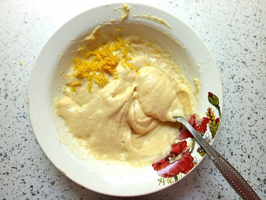 Следом добавьте лимонную цедру. Она придаст готовой выпечке нотку лимона. Лимон можно заменить на миндальный экстракт.