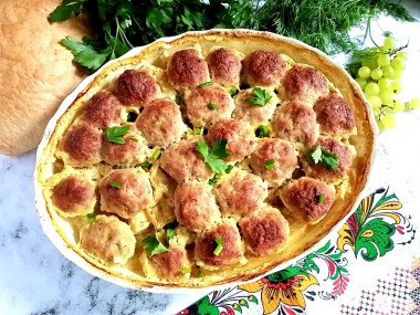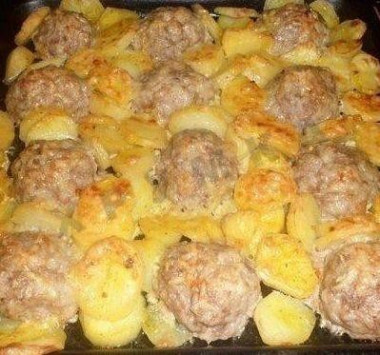 Запекала дольше из-за объема продуктов, у меня получилось 1,5 часа под фольгой и 30 минут без нее. В любом случае нужно проверять готовность, проткнув дольку картофеля. Картошка и фрикадельки выделили достаточно сока, так что картошка у меня томилась в сметанной подливке. Очень нежной получилась благодаря этому! Фрикадельки мягкие, вкусные, сверху румяная корочка! Это отличный сытный ужин!