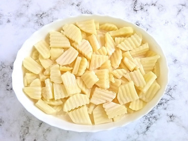 Продуктов взяла побольше, чтобы хватило на большую форму. Картошку нарезала фигурным ножом, смешала с приправой для картофеля и паприкой. Затем перемешала со свежей и вкусной сметаной. Так как картошки много, решила на дно влить немного воды, примерно сантиметр.