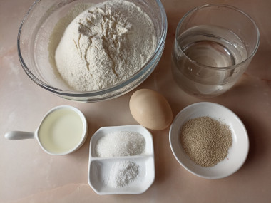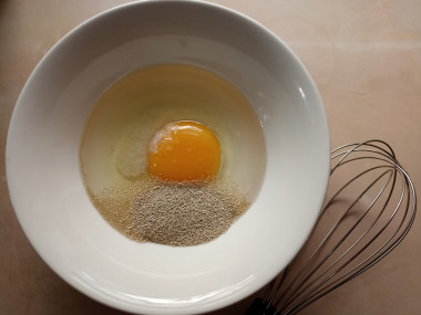 1. Яйцо разбиваем в миску, добавляем щепотку соли и сухие дрожжи, перемешиваем с помощью венчика.