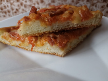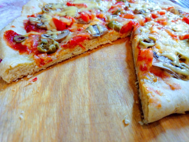 Из этого количества ингредиентов получилась основа для пиццы размером около 30 см. Выпекала пиццу в течение 12 минут при 190 градусах. Основа получилась достаточно плотная, не пышная. Отличный вариант для пиццы. Сын остался доволен.