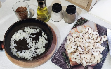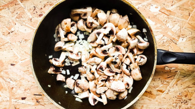 К обжаренном луку добавьте грибы и обжарьте их до выпаривания жидкости