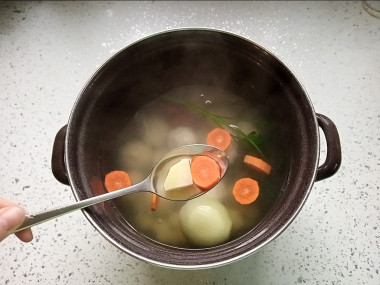 Кусочками лук уже не резала, его вкус уже есть в бульоне. Морковку нарезала кружочками и опустила в бульон вместе с картошкой. Дальше варила до готовности картошки. Специи не стала использовать, только посолила.