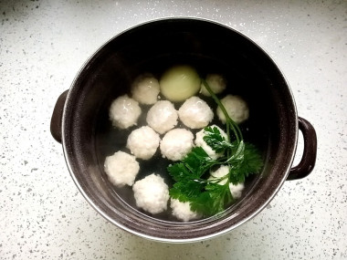 Для ребенка сварила диетический суп с фрикадельками из индейки. Фарш сделала сама из кусочка грудки индейки. Лук прокрутила вместе с мясом, чтобы он не чувствовался. Фрикадельки отваривала пол часа вместе с целой луковицей и веточкой петрушки.