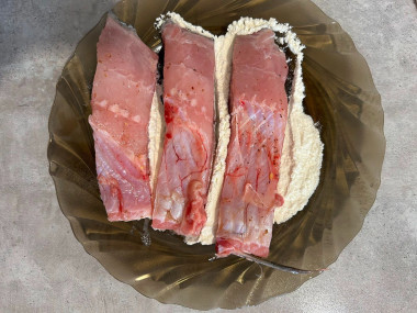 Голову можно пожарить или заморозить вместе с хвостом и плавниками, а в дальнейшем приготовить ароматный рыбный бульон или сварить уху. Тушку разрежьте вдоль на два пласта. Каждую половинку нарежьте на кусочки шириной около 3-4 сантиметров.