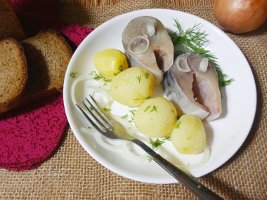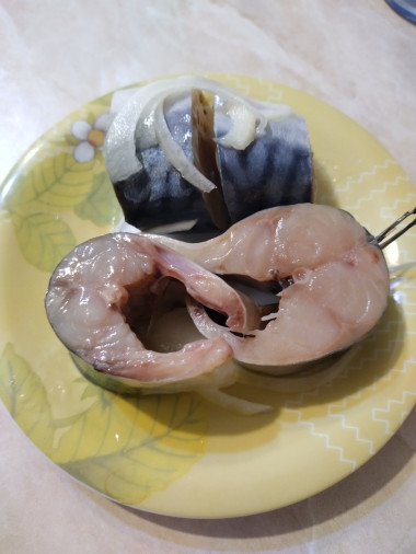 Залейте скумбрию водой так, чтобы она полностью покрыла нашу рыбку, у меня ушло около 500 мл. Воду берите чистую фильтрованную, в противном случае она может придать блюду неприятный привкус.
