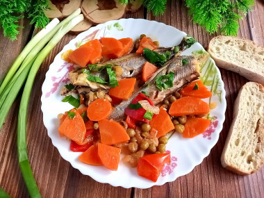 Рыбку уложила сверху вместе с горошком и тушила на небольшом огне минут 15. При подаче посыпала рыбу тушеную с овощами рубленой петрушкой.