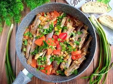 В самом конце добавьте к ней зеленый горошек. Если у вас нет свежего горошка, то возьмите консервированный.