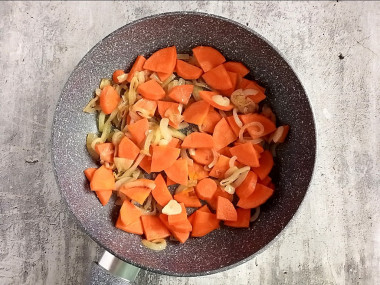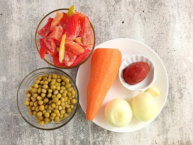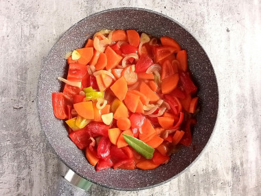 Лук нарезала полукольцами, морковь четвертинками, обжарила. Затем добавила болгарский перец, он у меня был замороженный крупными кусочками. Вместо томатного сока у меня паста, разведенная водой. Также дополнила овощи зубчиком чеснока и лавровым листочком. Летом еще и кабачок добавила бы).