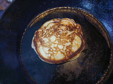 Разогрейте на сильном огне сковороду с толстым дном. Смажьте ее каплей растительного масла. Наливайте на сковороду половником тесто в середину, распределяя его равномерно по дну.