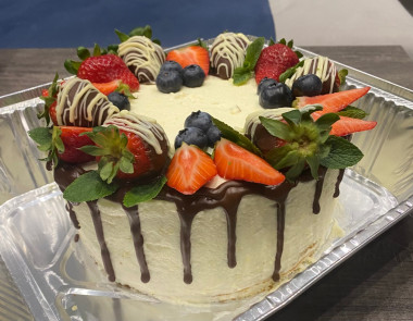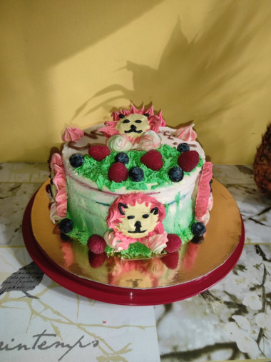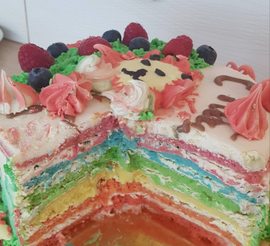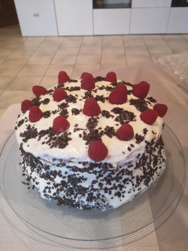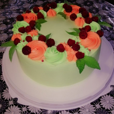 Хороший рецептик! Торт делала для небольшого семейного торжества. В крем для украшения добавила пищевые красители, сверху разложила ягоды малины, "бусины" и листики мяты.