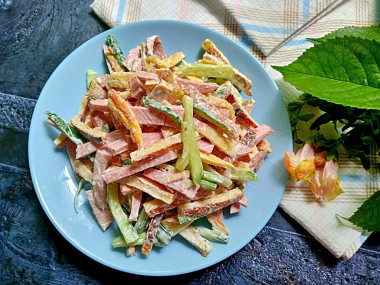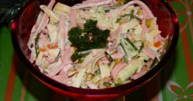 Вкусный и простой салат за считанные минуты! Салат с блинами и копченой колбасой - один из самых легких и быстрых в приготовлении салатов. Этот вариант для случая «гости на пороге». Спасибо за рецепт!