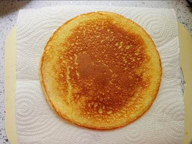 У меня получилось 4 блинчика. Но количество не важно для этого салата, делайте столько, на сколько хватает теста. Сковороду смазывайте маслом по необходимости, если блины начинают приставать к сковороде. Полностью остудите готовые блины.