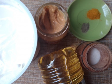 В просторную миску выложите свежую жирную сметану. Добавьте растительное масло, соль ЧЕРНУЮ (она даст привкус вареного яичного желтка), куркуму, черный молотый перец (можно также добавить немного карри, асафетиды). Положите немного готовой горчицы, лимонный сок.