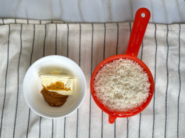 Как сделать рис с куркумой на гарнир? Подготовьте все продукты. Рис выбирайте качественный. По форме это может быть и круглозерный рис, и длиннозерный на ваше усмотрение. Подробнее о выборе риса читайте в отдельной статье по ссылке в конце рецепта. Масло выбирайте натуральное жирностью не менее 82%. Куркума у меня сушеная и измельченная, но можно взять и свежий корень куркумы и натереть его.