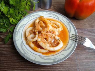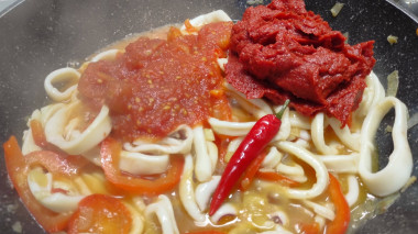 Понравился мне этот рецепт с кальмарами. Раньше я ела только копчёные и сушеные кальмары, решила попробовать сделать кальмары в томатном соусе, взяв за основу этот рецепт. Только не использовала болгарский перец и перец чили. Вместо помидоров взяла томатную пасту и разбавила водой. Сначала приготовила соус из чеснока, лука и томатного соуса. Кальмар у меня был чищенный и замороженный. Размораживала тубу кальмара щадящим способом, положив в холодильник на ночь. Порезала тубу кальмара кольцами и добавила в томатный соус. Тушила по описанию в рецепте. Очень простой способ приготовления, хоть и длительный. Результат меня очень порадовал. Кальмары вышли не резиновые, очень нежные и вкусные. Подавала кольца кальмаров с пастой, полив томатным соусом. Это нереально вкусно. Прекрасный рецепт! Большое спасибо автору!