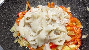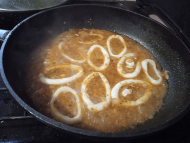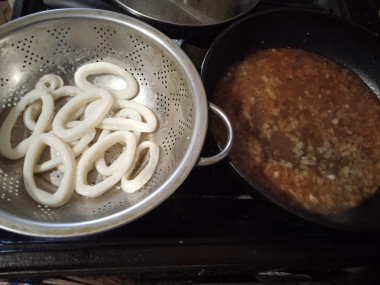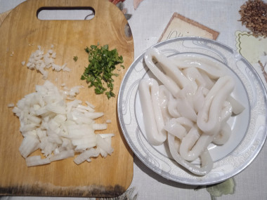 1. Кальмаров режем кольцами шириной примерно 1,5 - 2 см.