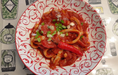 Кальмары ы томатном соусе, прекрасное блюдо (судя по всему) Средиземноморской кухни. Яркое сочетание вкусов морепродукта и томата, с пикантной остротой перчика чили и отголосками других специй. Блюдо хорошо как в горячем, так и холодном виде.