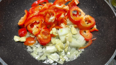 4. На оливковом масле обжариваем подготовленные овощи пока лук не станет прозрачным, примерно 5 минут, затем выкладываем к овощам и жарим до тех пор, пока кольца не станут держать форму.