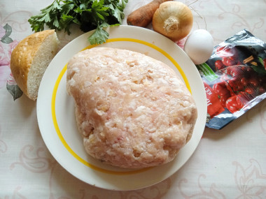 Калорийность продуктов: Фарш свинина говядина, Молоко, Белый хлеб, Яйца, Петрушка, Перец черный молотый, Соль, Томатная паста, Лук, Вода