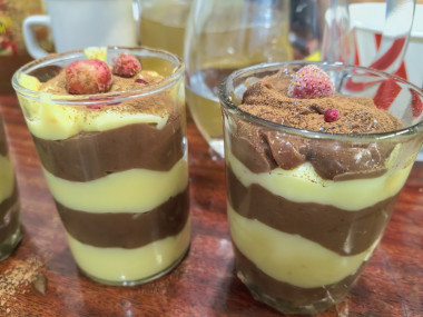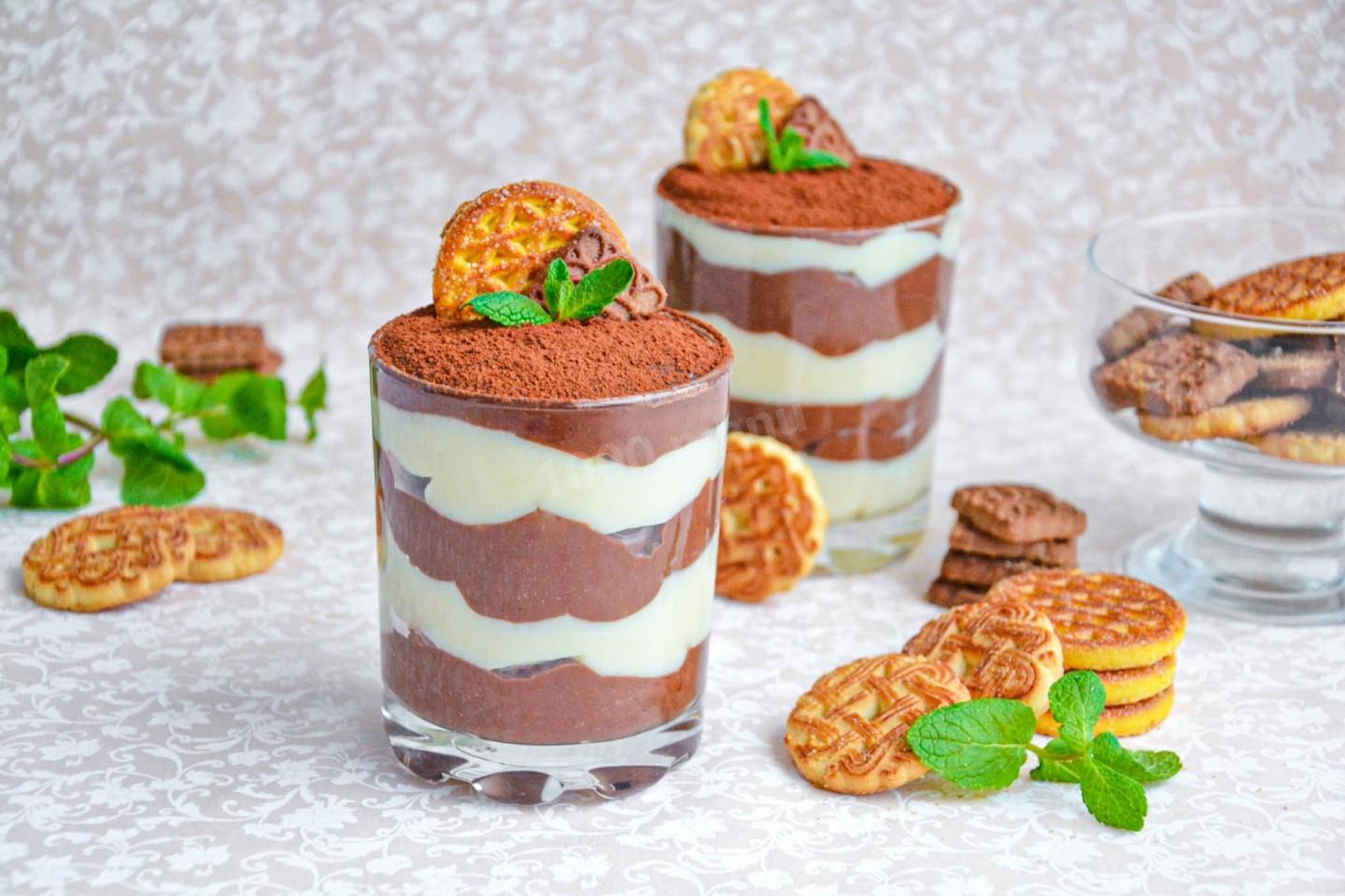 Чередуя слои, отсадите в стаканы обе массы. У вас должен получиться десерт слоями, белым и шоколадным. Можете сами выбрать толщину слоев. Даже неровные они будут красиво смотреться в прозрачном стакане. В качестве дополнительной прослойки можно использовать поломанное на кусочки сахарное печенье. Готовый десерт поставьте на 30 минут в холодильник. Перед подачей посыпьте десерты какао, украсьте печеньем и мятой.