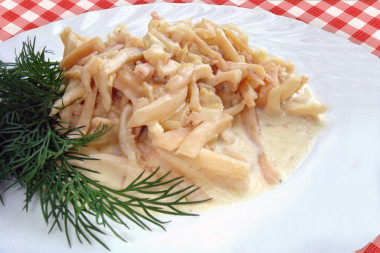 Кальмары в чесночном соусе получились очень вкусные, пикантные, нежные. Нарезала кальмары соломкой вместо колечек. Закуска то, что надо. Приготовила на ужин, теперь буду удивлять гостей)))